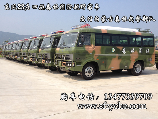 東風(fēng)23座四驅(qū)森林消防專用運(yùn)兵車型號(hào)為EQ6680ZTV,采用軍工東風(fēng)EQ6650KZ5T 三類底盤,發(fā)動(dòng)機(jī)型號(hào):ISD160 50康明斯160馬力國五排放,變速箱為手動(dòng)六檔變速箱,整車外形尺寸長(zhǎng)寬高(6800X2320X2800,3010)mm 驅(qū)動(dòng)形式:4×4,離合助力,方向助力,斷氣剎,鼓式自動(dòng),車橋?yàn)闁|風(fēng)德納,輪胎為7.50R20鋼絲胎,外行李架,工具箱3個(gè),前置防裝杠,粘接式推拉玻璃,鋁花紋地板,中檔座椅,,手動(dòng)式外擺門,153駕駛室正副司機(jī)門,獨(dú)立柴油鍋爐暖風(fēng)機(jī)帶四個(gè)出風(fēng)口,窗簾,滅火器兩個(gè),備胎一個(gè)。選裝頂置派恩大功率空調(diào)機(jī)組。