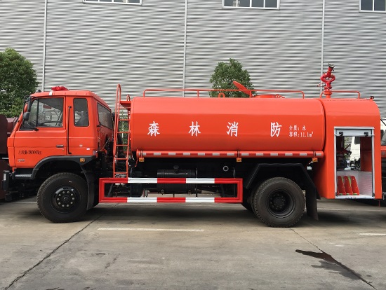 東風四驅越野森林消防水罐車_東風11.1噸四驅消防水車_國五四驅越野森林滅火水車_東風4×4越野SCS5183GPSEQ型四驅綠化噴灑車簡介:采用東風EQ2180GD5DJ型越野汽車底盤,東風153寬體駕駛室,4×4驅動,康明斯ISB190 50國五發動機,六檔變速箱,東風商用車橋,前驅動橋3.8噸,后橋10噸,10.00R20輪胎,軸距4500mm,電動玻璃,方向助力,斷氣剎,ABS。罐體采用優質碳鋼Q235板材,板材厚度4mm,罐體容積11.1立方,安裝夾心取力器,后置泵箱,消防栓接口左右各一個,消防炮采用PS40消防水炮,流量40L/S/1.0MPa 水射程:≥50m,消防泵采用常壓消防泵型號:CB10/40車用消防泵,流量:40L/s,壓力:1.0MPa,駕駛室頂部安裝長條警燈帶喊話器,全車顏色橘紅,兩側噴涂白色森林消防字樣。