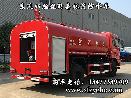 東風新款四驅越野森林消防灑水車_東風11.1噸四驅消防水車_國五四驅越野森林滅火水車_東風4×4越野SCS5183GPSEQ型四驅綠化噴灑車簡介:采用東風EQ2180GD5DJ型越野汽車底盤,東風D913新款駕駛室,4×4驅動,康明斯ISB190 50國五發動機,六檔變速箱,東風商用車橋,前驅動橋3.8噸,后橋10噸,10.00R20輪胎,軸距4500mm,電動玻璃,方向助力,斷氣剎,ABS。罐體采用優質碳鋼Q235板材,板材厚度4mm,罐體容積11.1立方,安裝夾心取力器,后置泵箱,消防栓接口左右各一個,消防炮采用PS30-50D消防水炮,流量40L/S/1.0MPa 水射程:≥50m,消防泵采用常壓消防泵型號:CB10/40車用消防泵,流量:40L/s,壓力:1.0MPa,帶前沖,駕駛室頂部安裝長條警燈帶喊話器,全車顏色橘紅,兩側噴涂白色森林消防字樣。