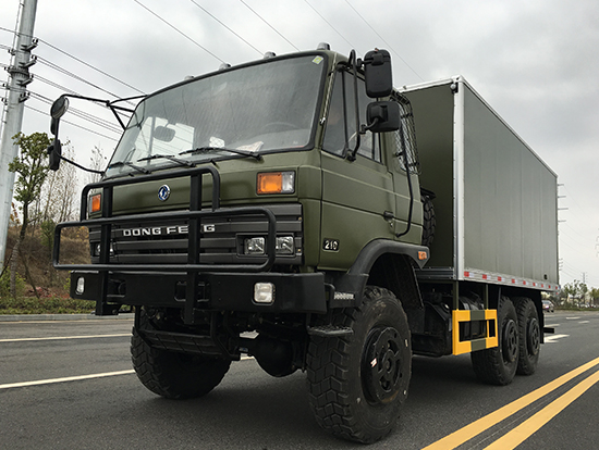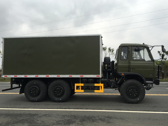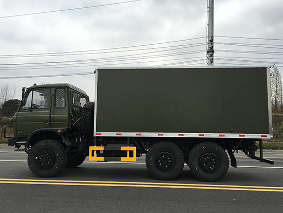 東風六驅越野廂式車采用東風越野卡車底盤DFS5160GLJ2 ,東風153平頭一排半駕駛室,6*6驅動,康明斯210馬力,韶齒6檔變速箱,斷氣彈簧制動,貫通式中后驅動橋,12.5R20越野胎,軸距 3500+1250mm,加厚雙層大梁,帶軍用保險杠。六驅越野廂式車,廂體根據用戶需要形式多樣,選裝多樣,可以選裝空調、側門、側窗、發電機、裙邊結構等.