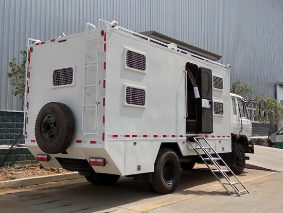 三、東風四驅越野宿營車, 4驅越野宿營車用途:適用公安、特警、公安、邊防、衛生、交通、礦山、地質、軍隊等部門]長期野外作業、勘察、救援、搶險、救災等宿營用,箱體空間利用大化。內部配置:配備前儲物柜、后儲物柜、液晶電視機應急燈、頂燈、頂置空調、床墊、被褥等。選裝配備8組豪華折疊臥鋪、未鋪上下梯、安全保險帶、電源插口等,細節精致。外置燃油加熱器、頂護欄、前爬梯、隱藏抽拉梯、專用房車門、專用玻璃滑窗、警示燈等。