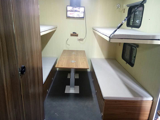 3、休息區備有4個上下鋪8個床位,配有床墊,每個上下床鋪依靠的墻壁上都有一個風景透氣窗。每個床鋪下面設一組附件柜,床位兩側上方各配衣帽鉤、插座和可調節床頭燈,休息區配有19寸液晶電視一臺及空調一部。
